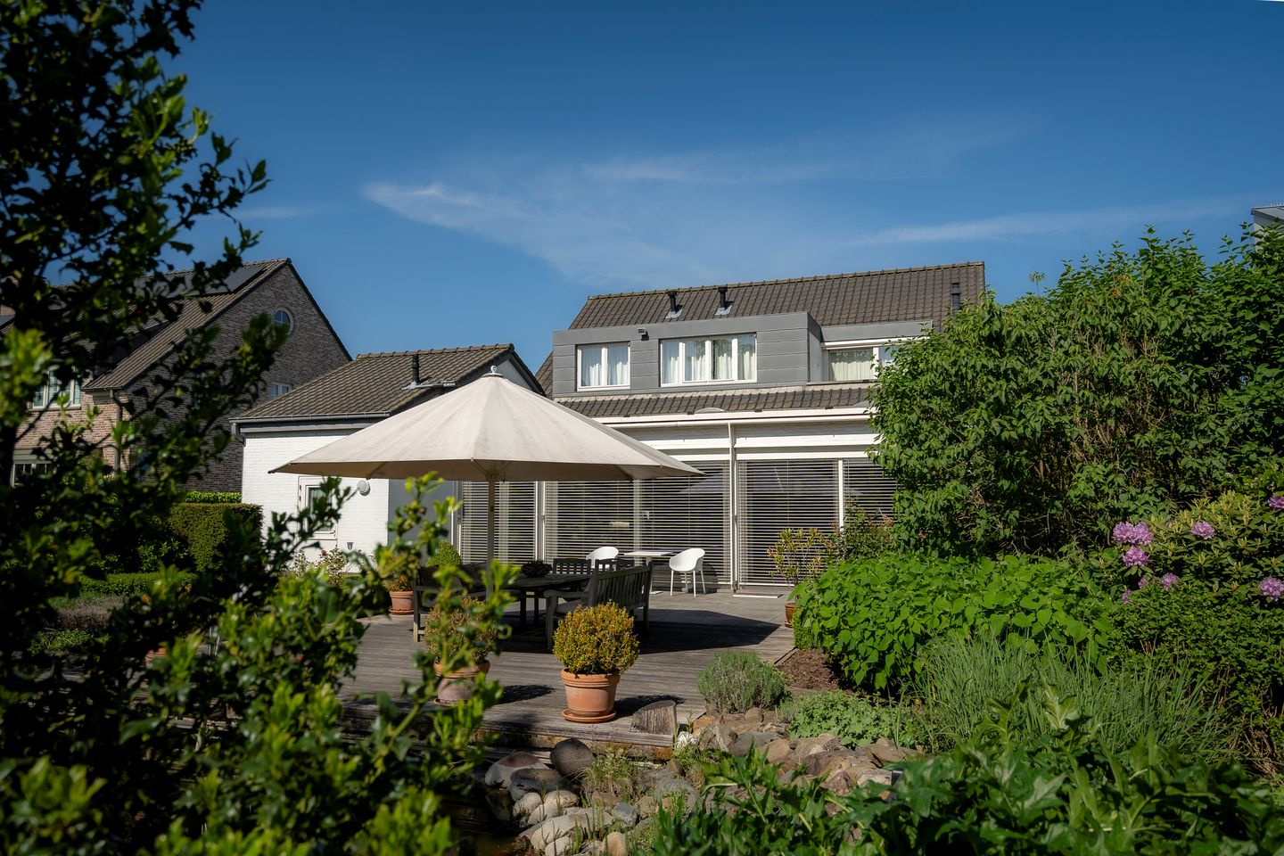 De verzorgde tuin is volledig omheind en biedt door de groene beplanting volledige privacy. Daarnaast beschikt de tuin over een zwemvijver, een ruim terras en een tuinhuis.