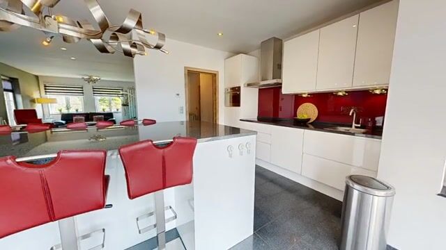 - De open keuken is v.v. een inductiekookplaat, dampkap, combi-oven, afwasmachine, wasbak, airco en openslaande deuren naar de tuin;