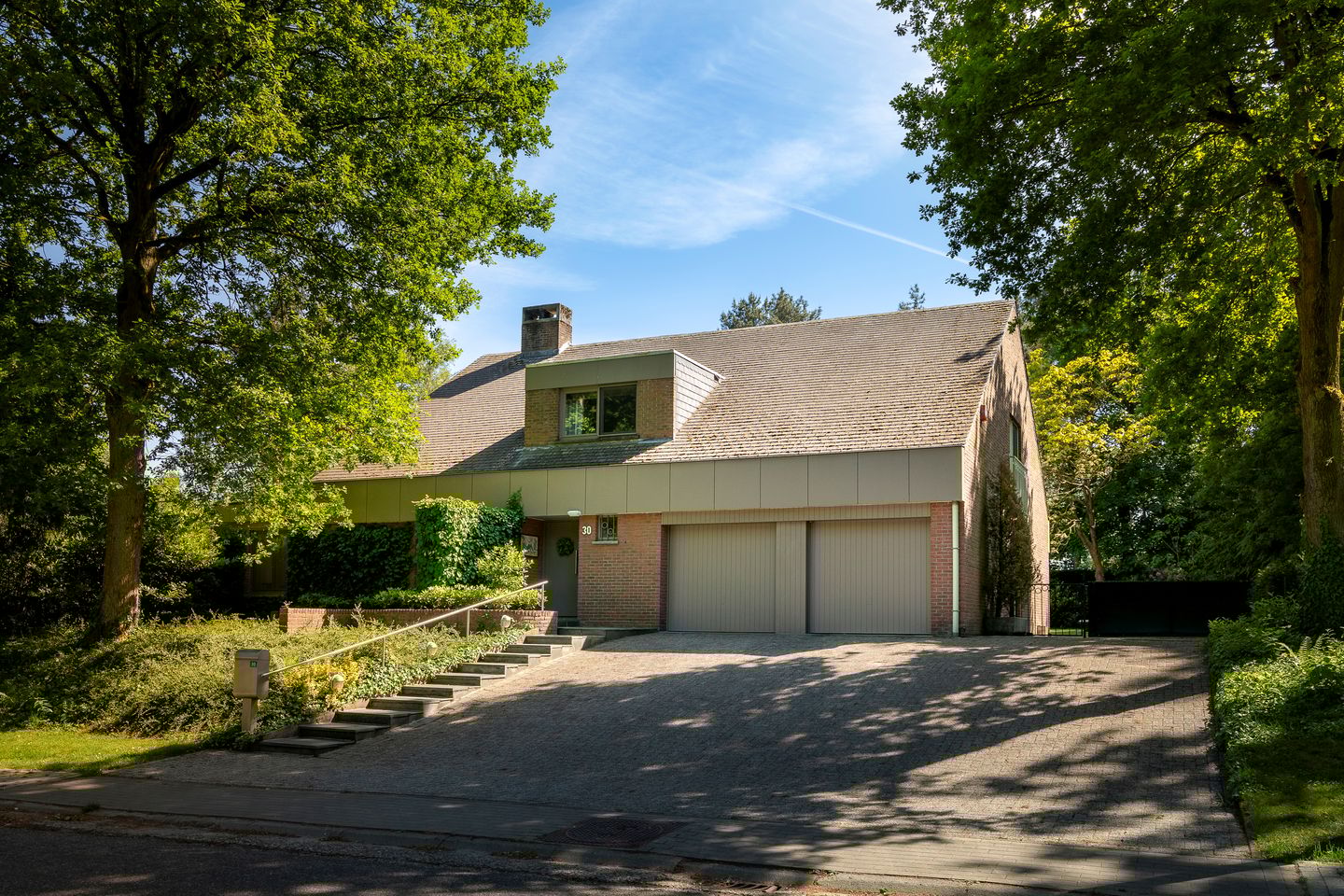 De gelijkvloerse verdieping omvat een royale inkomhal met gastentoilet, een sfeervolle zithoek, een ruime woonkamer met sfeervolle houthaard en een vergunde veranda met zicht op de tuin. De keuken is functioneel ingericht en sluit aan op een praktische berging of bijkeuken. Daarnaast is er een garage voor twee voertuigen voorhanden.
