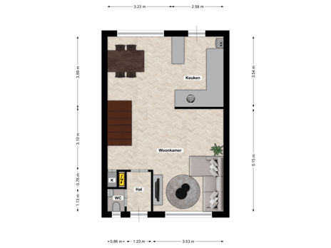 4) 2.55m x 2.08m, is uitgerust met aansluitpunten voor witgoedapparatuur.