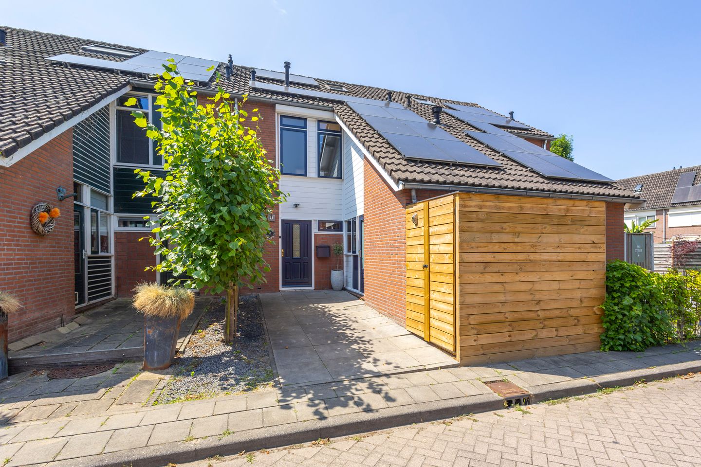 De achtertuin is een heerlijke, zonnige plek aan het water, gelegen op het westen. Hier kun je tot laat op de dag genieten van de zon en de rust. De tuin is onderhoudsvriendelijk aangelegd. Onder de fraaie overkapping (geplaatst in 2023) is het heerlijk vertoeven – of je nu wilt ontspannen met een goed boek, gezellig wilt borrelen of gewoon lekker buiten wilt zijn, hier zit je beschut en comfortabel. In 2020 zijn de tuintegels vernieuwd en het elektrische zonnescherm aan de achterzijde (2021) zorgt voor verkoeling op warme zomerdagen. Kortom: een tuin waar je ieder seizoen plezier van hebt!