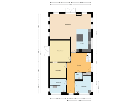 Entree met trapopgang, garderobe en meterkast; separaat toilet; woonkamer die grenst aan de open woonkeuken. Vanuit de hal zijn ook de bijkeuken, badkamer en de werkkamer/slaapkamer I met inloopkast toegankelijk.