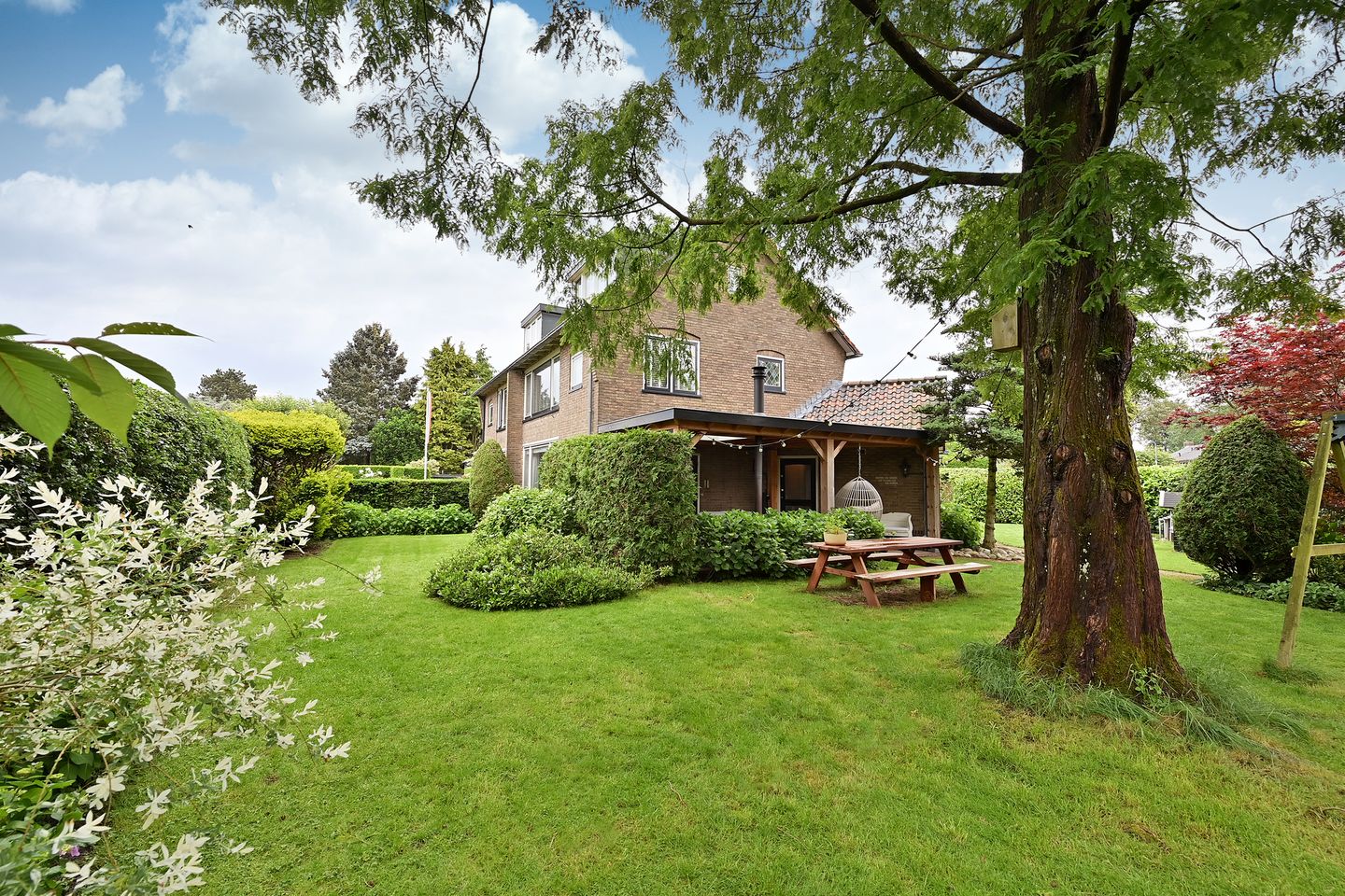 De tuin is via twee poorten afgesloten en omzoomd door een groene heg.