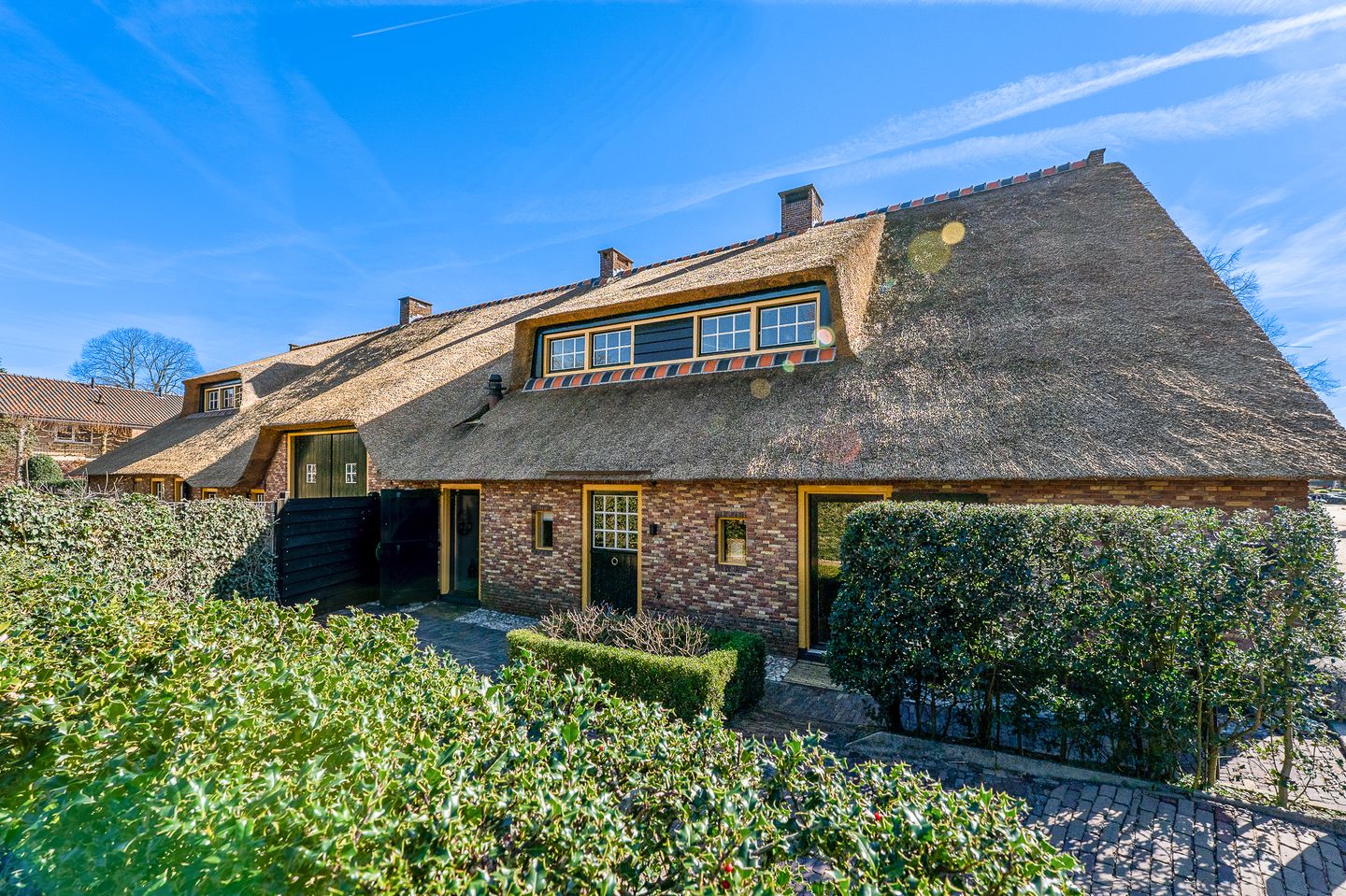 In het hart van Laren, verscholen aan een rustig en karakteristiek pad, ligt deze markante rietgedekte woonboerderij. Een voor Larense begrippen zeer hoge boerderij, die zich eenmaal binnen ook verrassend ruim en indrukwekkend ontvouwt. Gelegen in het deel ‘Oud-Laren’, binnen beschermd dorpsgezicht, is de authentieke sfeer hier nog tastbaar. Vanuit het Krommepad loopt u zo het centrum in, met zijn winkels, terrassen en restaurants, terwijl ook het natuurgebied van het Goois Natuurreservaat zich op korte loopafstand bevindt. De boerderij is in 1998 volledig opnieuw opgebouwd geheel in oude stijl, met gebruik van traditionele materialen en zichtbare constructies. Oorspronkelijk bestond dit deel uit twee woningen; na samenvoeging in 2017 is een royaal en samenhangend geheel ontstaan dat volledig aansluit bij hedendaagse woonwensen.