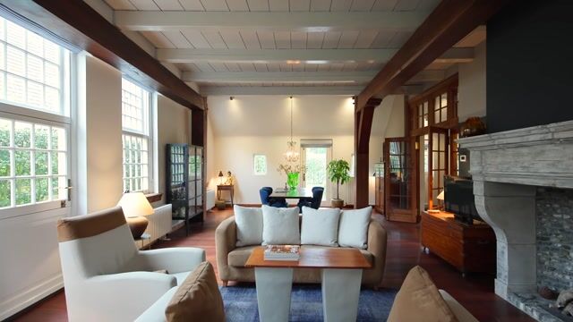 De begane grond verrast direct door haar maatvoering en ruimtelijkheid. Met een plafondhoogte van ruim drie meter en een woonkamer van circa 76 m² ontstaat een indrukwekkende leefruimte, waarin licht en volume de hoofdrol spelen. De zichtbare balkenconstructie en de zware massieve groenhart houten pilaren en liggers geven de ruimte een krachtig en authentiek karakter. De vloer bestaat uit uitzonderlijk lange en brede Basralocus hardhouten planken, die de sfeer van het huis verder versterken.