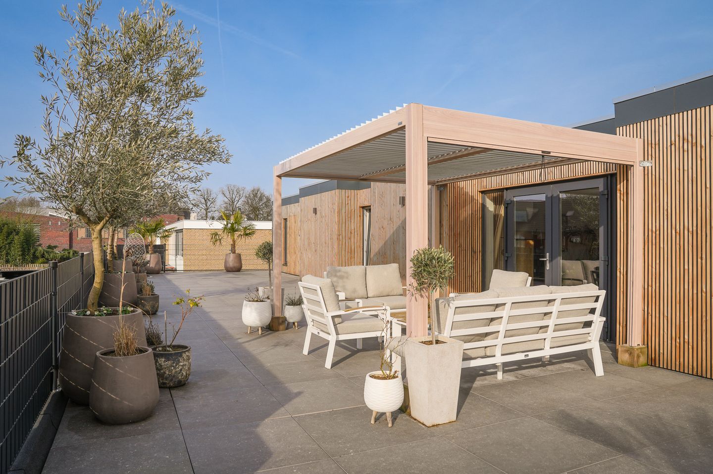 Zoiets komt u zelden tegen bij een appartement. Een opvallend groot dakterras van 132 m² groot met een lamellen zonnescherm. Groot formaat, moderne keramische tegels maken dit een aangename plek om te relaxen. Zeker in combinatie met het unieke uitzicht op de kerktoren. 's-Avonds geven de wandverlichting een schitterend effect op de houten wandpanelen waardoor u zicht in zuidelijke sferen begeeft! Op het dakterras zijn diverse stopcontacten aanwezig.