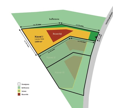 Een kaart zonder maten die de ligging van de percelen aangeeft. Bevat grenzen en perceelnummers.