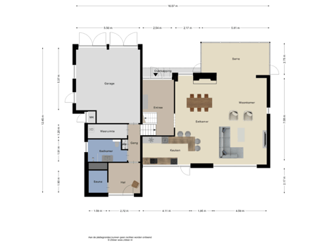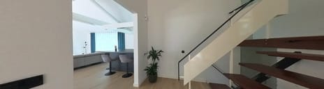 Via de bestrate oprit bereikt u de trap naar de entree van de woning. De entree geeft toegang tot een ruime ontvangsthal, vide en een trap naar zowel de benedenverdieping als de eerste verdieping. Vanuit de hal betreedt u de royale woonkamer met serre en de open keuken.