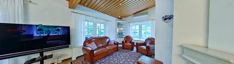 De ruime, lichte woon-/eetkamer biedt volop mogelijkheden! Aan de voorzijde geniet u van een royaal eetgedeelte, met prachtig uitzicht over de fraai aangelegde tuin. Grote raampartijen aan de voor-, en achterzijde zorgen voor een overvloed aan natuurlijk licht en een aangename sfeer. De plavuizen vloer loopt naadloos door naar de woonkamer, wat zorgt voor een rustige uitstraling. Lange avonden tafelen met vrienden en familie naast de open haard, wie wil dat nou niet? Aan de achterzijde van de woning is de woonkamer gesitueerd, met openslaande tuindeuren naar het overdekte terras. Ook bevindt zich hier een airco voor verkoeling in de zomer. Alle ramen zijn voorzien van rolluiken en door de doorlopende houten plafonds waant u zich in een vakantiewoning.