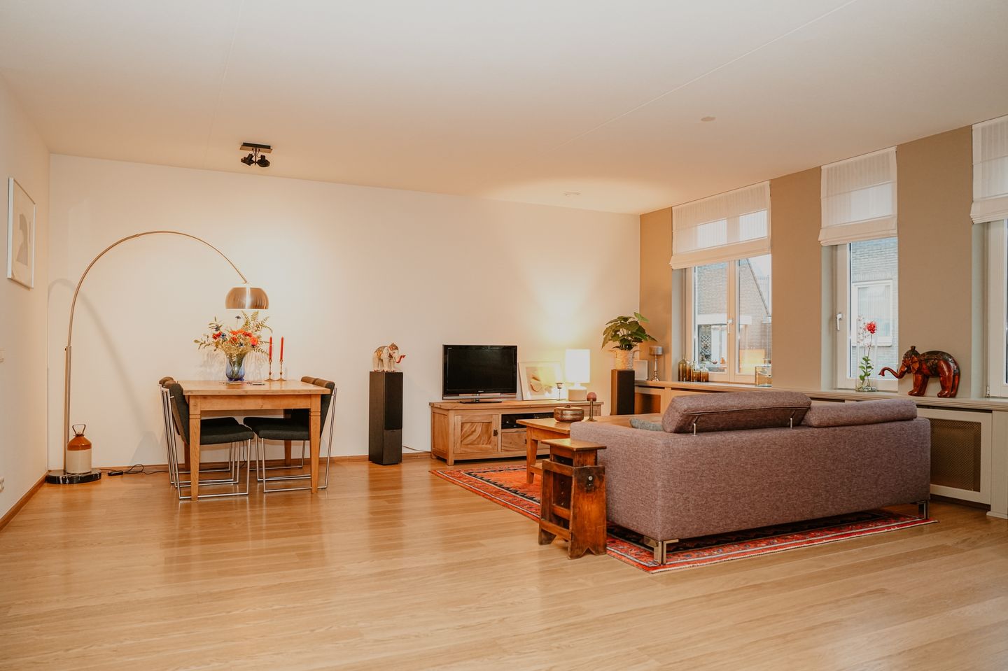 De ruime woonkamer heeft grote raampartijen die zorgen voor veel lichtinval. Via de openslaande deuren stap je de woonkamer binnen, deze deuren zorgen ook voor een extra ruimtelijk gevoel. Er is voldoende ruimte voor een uitgebreide zithoek en ruime eettafel. Perfect voor een diner met familie en vrienden.