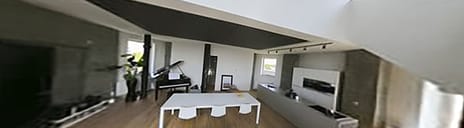 Op de tweede verdieping ontvouwt zich het hart van het huis: een royale woonkamer met open keuken, zithoek en eettafel. Hier ervaar je de hoogte van de toren: de plafonds reiken tot aan de volgende vloer, het daglicht valt rijkelijk binnen via grote ramen aan meerdere zijden. Beton en witte vlakken wisselen elkaar af, het interieur is minimalistisch en krachtig. De concertvleugel en het brede werkblad onderstrepen het karakter van deze leefruimte: ruimtelijk, creatief, uitnodigend.