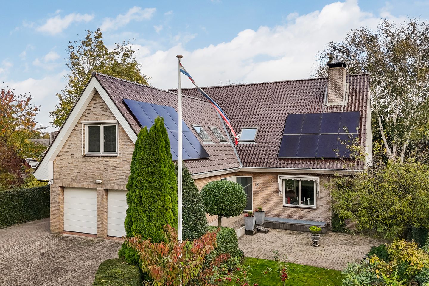 Links van de woning is een overkapping voor het parkeren van de auto, daarnaast biedt de dubbele garage ook plek voor het parkeren van de auto's.