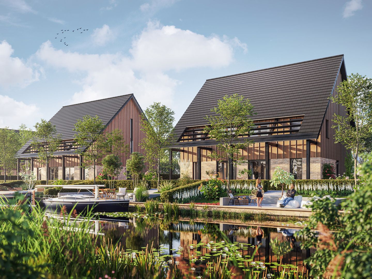 Deze vrijstaande en halfvrijstaande woningen hebben niet één maar twee tuinen. De woningen liggen aan een openbaar wandelpad langs de waterkant. Even dat pad oversteken en je staat in je eigen overtuin, pal aan het water. Hier geniet je van een onbelemmerd uitzicht over de vaart. Daarnaast heb je een grote op het zuiden gerichte privé tuin aan de straatkant. Dat betekent: kiezen tussen buiten zitten met wat reuring en uitzicht op het water, of met wat meer privacy, genieten van de zon. Aan de kant van de straat wordt een 'voordeurfunctie' gemaakt bij de berging. Naast de houten berging is ruimte voor een parkeerplaats op eigen terrein, met daarboven een pergola.