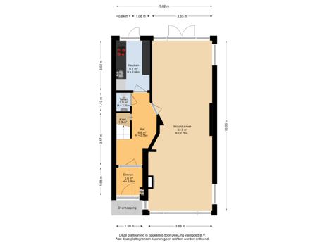 - 54 m² (10,25 meter diep en 9,19 meter breed)
