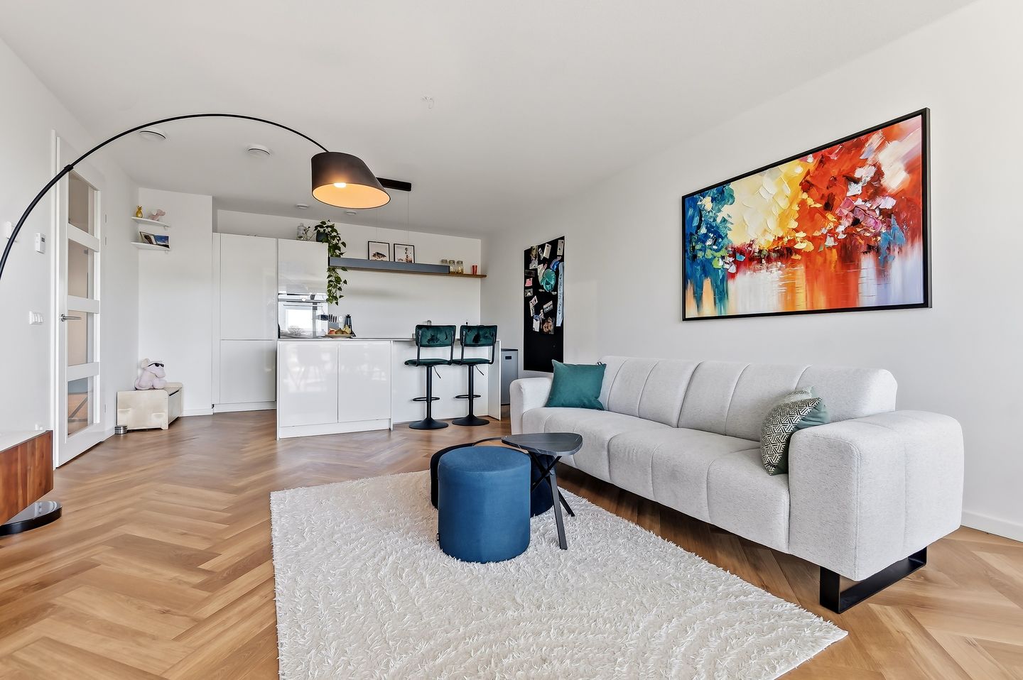 Wanneer je het appartement betreedt, kom je in de ruime hal met toegang tot alle vertrekken. De lichte woonkamer voelt direct prettig aan door de grote raampartijen en de open indeling. De moderne keuken sluit hier naadloos op aan en is voorzien van diverse inbouwapparatuur, waardoor koken en wonen mooi samenkomen.