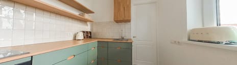 De nieuwe keuken in L-opstelling is modern vormgegeven en uitgerust met hoogwaardige inbouwapparatuur, waaronder een inductiekookplaat, afzuigkap, oven, koel-/vriescombinatie, en vaatwasser. Hier bevindt zich tevens de combiketel (Remeha, 2024) en een deur naar het balkon.