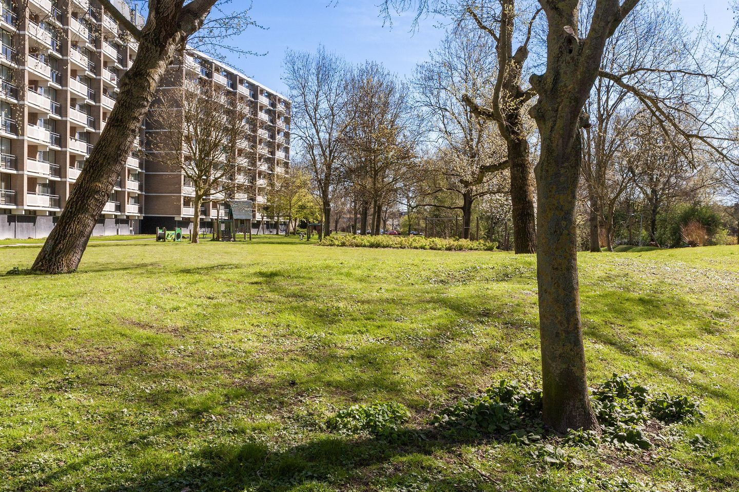 Het appartement is voorzien van een lichte woonkamer met vaste kasten en een gesloten keuken (eenvoudig door te breken), drie slaapkamers, een basis badkamer met douche en een zonnig balkon op het zuiden met een leuk uitzicht op het park.