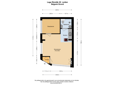 Entree, kleine hal, woonkamer (ca. 4.82 x 4.15 m.), open keuken (ca. 1.87 x 1.70 m.) met inbouw 4 pits inductie kookplaat, afzuig/filterkap, nette badkamer (ca. 1.87 x 1.52 m.) met douche met thermostaatkraan, vrijdragend toilet en opstelling van de boiler en wastafel, 1 slaapkamer (ca. 2.90 x 2.39 m2).