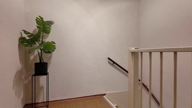 At the front of the building is the spacious and wonderfully sunny living room with a door leading to the south-facing balcony. The semi-open kitchen is equipped with various built-in appliances, including a dishwasher, gas cooktop, extractor hood, refrigerator, freezer, and combination microwave/oven. The hallway features a boiler cupboard housing the central heating boiler, a toilet with a small sink, under-stairs storage, and a separate washing machine/utility cupboard.