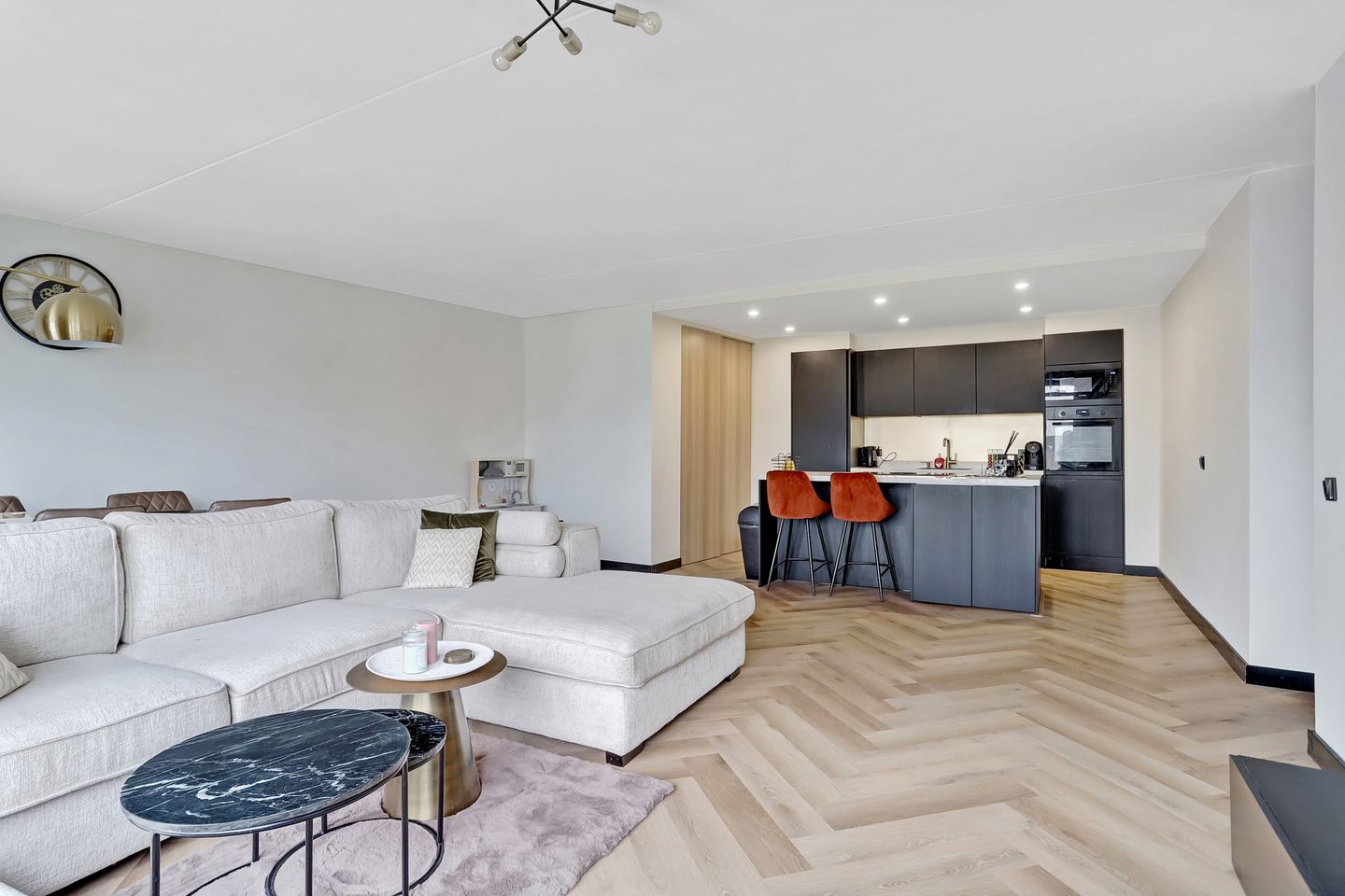 Begane grond:?Via de gezamenlijke entree bereikt u het appartement op de eerste verdieping. De hal is netjes afgewerkt en geeft toegang tot het moderne toilet, de badkamer, de slaapkamers en de leefruimte. Bij binnenkomst in de woonkamer valt direct het prachtige visgraat pvc-vloer op, die doorloopt in het gehele appartement. De woonkamer is ruim en licht dankzij de grote raampartijen en openslaande deuren naar het Frans balkon. Hier heeft u uitzicht op de charmante daken van de stad. De ruimte is royaal genoeg voor een comfortabele zithoek en een aparte eethoek. De open keuken is strak en modern ingericht met zwarte kastfronten, een wit werkblad en is voorzien van hoogwaardige inbouwapparatuur, waaronder een inductiekookplaat, afzuigkap, oven, combimagnetron, vaatwasser en koel-vriescombinatie. De keuken is functioneel en vormt een mooi geheel met de leefruimte. De luxe badkamer is een ware eyecatcher: afgewerkt met marmerlook tegels, een ruim bad, een regendouche met nisverlichting, dubbele wastafel met meubel en een designradiator. Alles straalt hier comfort en kwaliteit uit!