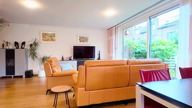 The entrance hall leads to a fully renewed meter cupboard with 3-phase power, and a spacious, luxuriously finished guest toilet. The living room and open-plan kitchen form a harmonious and light-filled living space, thanks to large windows on two sides. The kitchen is fully equipped with high-quality appliances, including a Miele dishwasher, induction cooktop, microwave, steam oven, refrigerator, freezer and close-in boiler — perfect for both everyday comfort and entertaining.