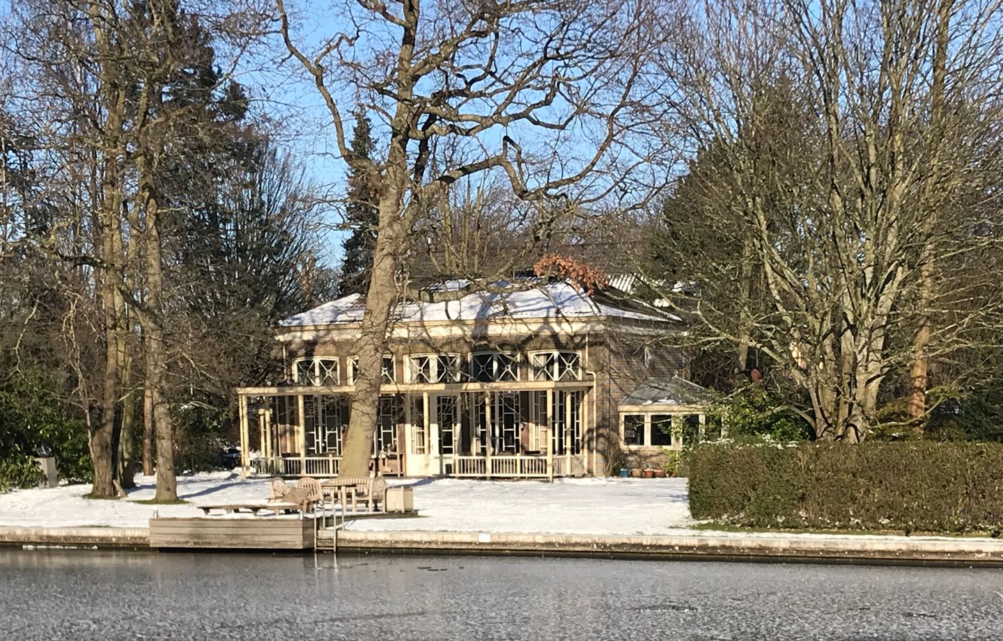 Wonen in een rijksmonument: een ruime orangerie omgevormd tot elegant woonhuis met een grote veranda aan de waterzijde.