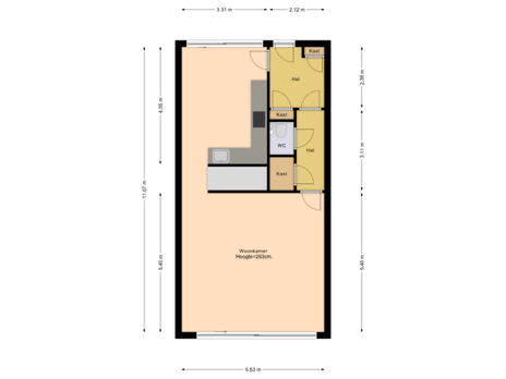 - 56 m² (10,13 meter diep en 5,53 meter breed)