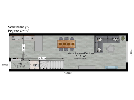 Via de nette hal – voorzien van een vernieuwde meterkast en een modern zwevend toilet met ventilatiesysteem – loopt u door naar de royale woonkamer. Dankzij de uitbouw aan de achterzijde is dit een bijzonder lichte en ruime leefruimte geworden.
