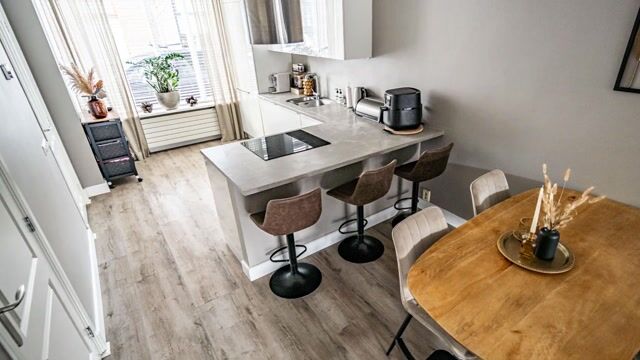 Bij binnenkomst valt direct de hoogwaardige afwerking op: vloerverwarming met laminaatvloer, strakke gestucte wanden en een plafond met inbouwspots zorgen voor een moderne, rustige uitstraling. De grote schuifpui trekt de aandacht én het daglicht naar binnen, maar we nemen eerst een kijkje in de keuken.