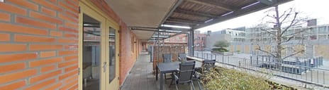 Door het portiek pakken we de trap of de lift naar de 1e etage. Direct naar de "galerij" en door naar het appartement. Via de entree kom je in een ruime hal met de garderoberuimte en meterkast. Vanuit hier lopen we door naar de woonkamer. Wat meteen opvalt is de speelse indeling en de andere indeling. De woonkamer ligt aan de achterzijde van het appartement en staat in directe verbinding met het grote dakterras (ca. 14m2) op het zuiden. Zet hier de deuren open en binnen en buiten lopen moeiteloos in elkaar over. Dit is echt een plek waar je vanaf het voorjaar tot ver in het najaar graag zit.