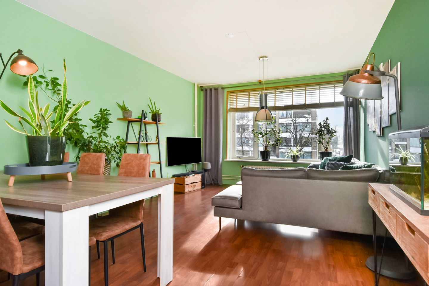 And then the living room, the heart of the apartment. As soon as you enter, the large windows immediately stand out. The natural light flows in pleasantly, giving the space an open and inviting character.