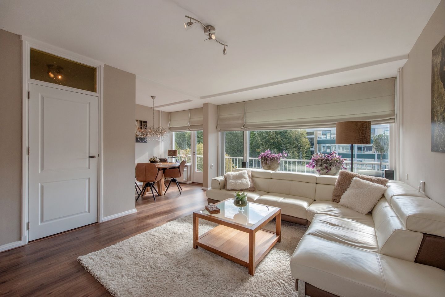 De lichte en ruime woon-/eetkamer (deels doorgebroken, 5.37 x 6.20 m) biedt volop ruimte voor een gezellige zithoek en eettafel. Vanuit hier stap je zo het brede balkon (1.26 x 7.50 m) op, eveneens gelegen op het zonnige zuidoosten.