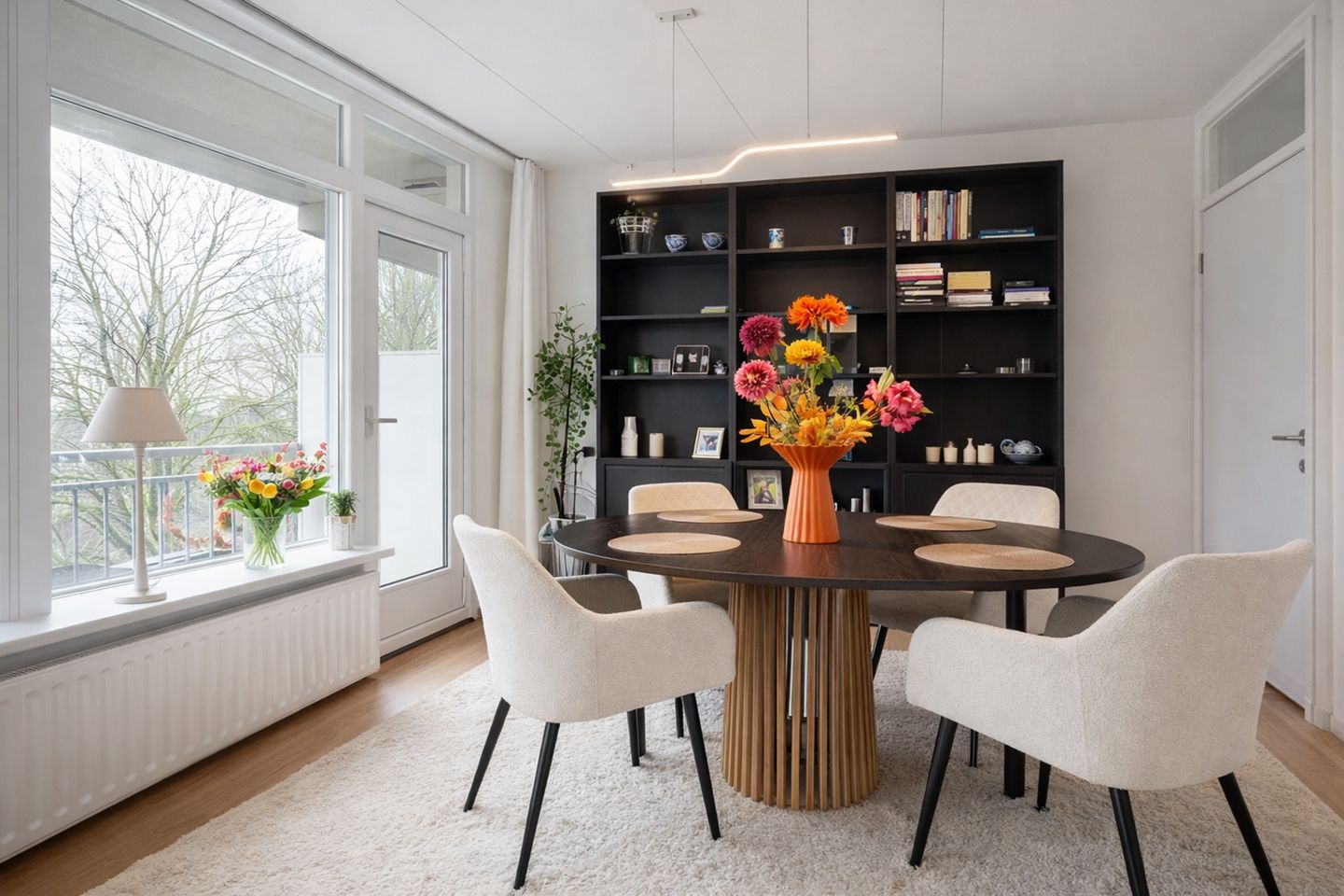 Eén van de kamers is samengevoegd met de woonkamer, waardoor een aparte woon- en eetkamer is ontstaan.