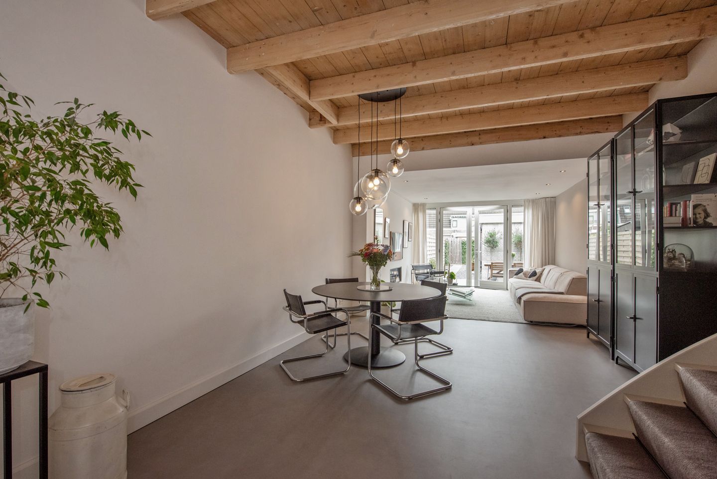Voortuin. Entree woning met fraaie markies (2023). Hal met uitgebreide meterkast (11 groepen) met voorbereiding voor glasvezel. Modern toilet met fonteintje. Entree naar het gezellige eetgedeelte aan de voorzijde met sfeervol originele grenen houten balkenplafond en luxe open keuken voorzien van diverse inbouwapparatuur te weten een oven, BORA inductiekookplaat met afzuiging, kokend waterkraan, vaatwasmachine en koel-/vries combinatie. Trapkast. Sfeervolle, lichte en ruime uitgebouwde woonkamer met Cinewall met ingebouwde elektrische sfeerhaard met verwarmingsfunctie en openslaande deuren naar de fraai aangelegde en zonnige achtertuin met schuur. De gehele begane grond is voorzien van een Novilon vloer en vloerverwarming. De keuken en woonkamer zijn voorzien van opbouw en inbouwspots met dimmers.