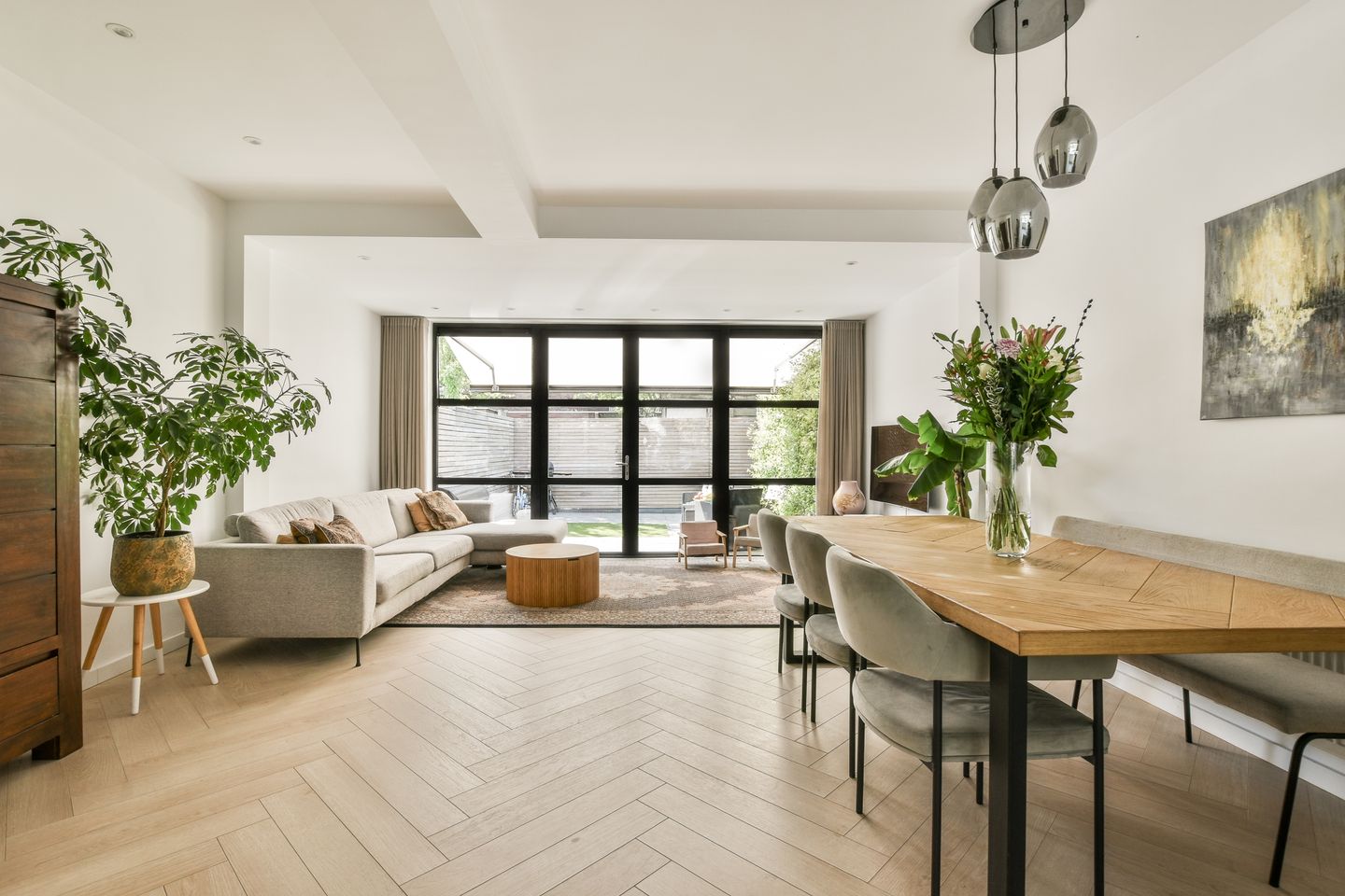 The sitting area is located at the rear, overlooking the garden. Thanks to the broad layout, there's plenty of space for both a sitting and dining area. The herringbone floor, black doors, sleek plastered walls, and recessed lighting create a stylish finish.