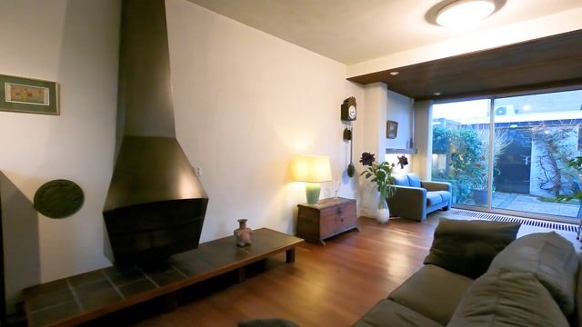 L-vormige woonkamer van ca. 37 m2 met parketvloer, openhaard en schuifpui naar tuin. Half open keuken in L-opstelling en voorzien van enige inbouwapparatuur.