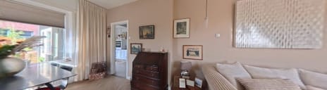 De royale woonkamer is ruim en licht door de ramen aan drie zijden en de gunstige zonligging. De PVC vloer is in visgraat motief gelegd.