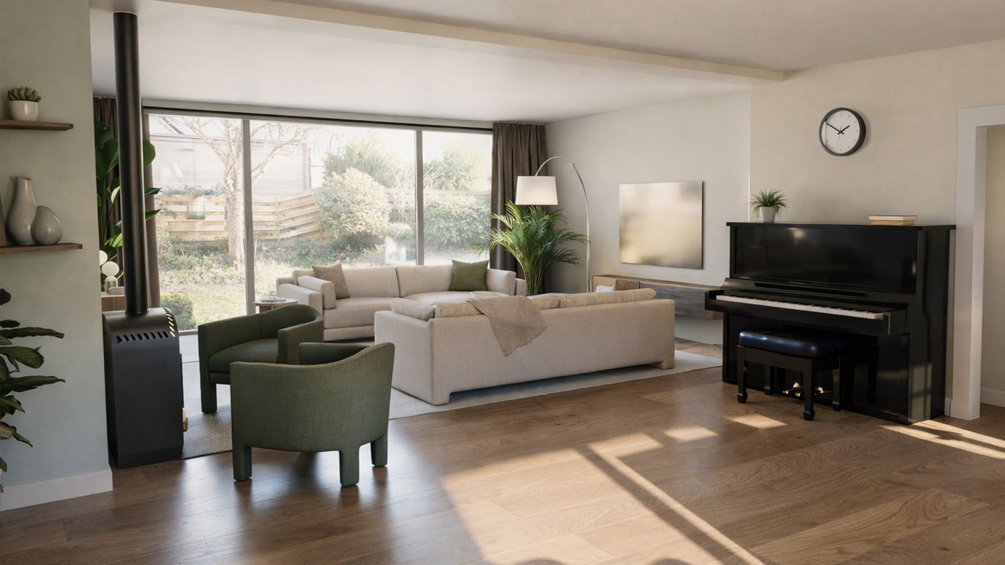 De woonkeuken is voorbereid en kan geheel naar eigen wens worden ingericht, eventueel met een kookeiland. De volledige begane grond is voorzien van vloerverwarming en afgewerkt met een strakke vloer, wat zorgt voor comfort en een moderne uitstraling.