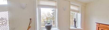 Bij binnenkomst via de garderobe kom je in de imposante hal. Hiervandaan kun je rechtsaf richting het nieuwe achterhuis of linksaf richting het voorhuis.