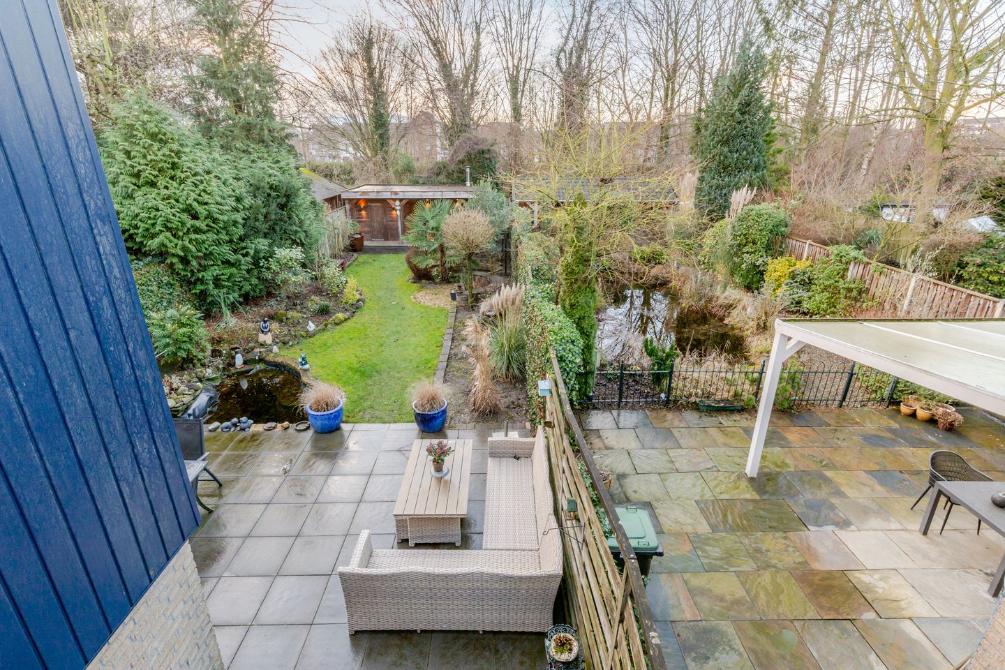 Tuin: De op het zuiden georiënteerde tuin heeft een afmeting van ongeveer 8 x maar liefst 25 meter diep, welke is voorzien van een ruim terras bij de woning. Naast een grote diversiteit aan beplanting is de tuin tevens voorzien van een vijver partij, maar bovendien van een fraaie overkapping (totaal circa 7,15 x 3,92 meter) met een extra berging en ruimte voor bijvoorbeeld uw haardhout aan het eind van de tuin alsmede diverse zitjes.