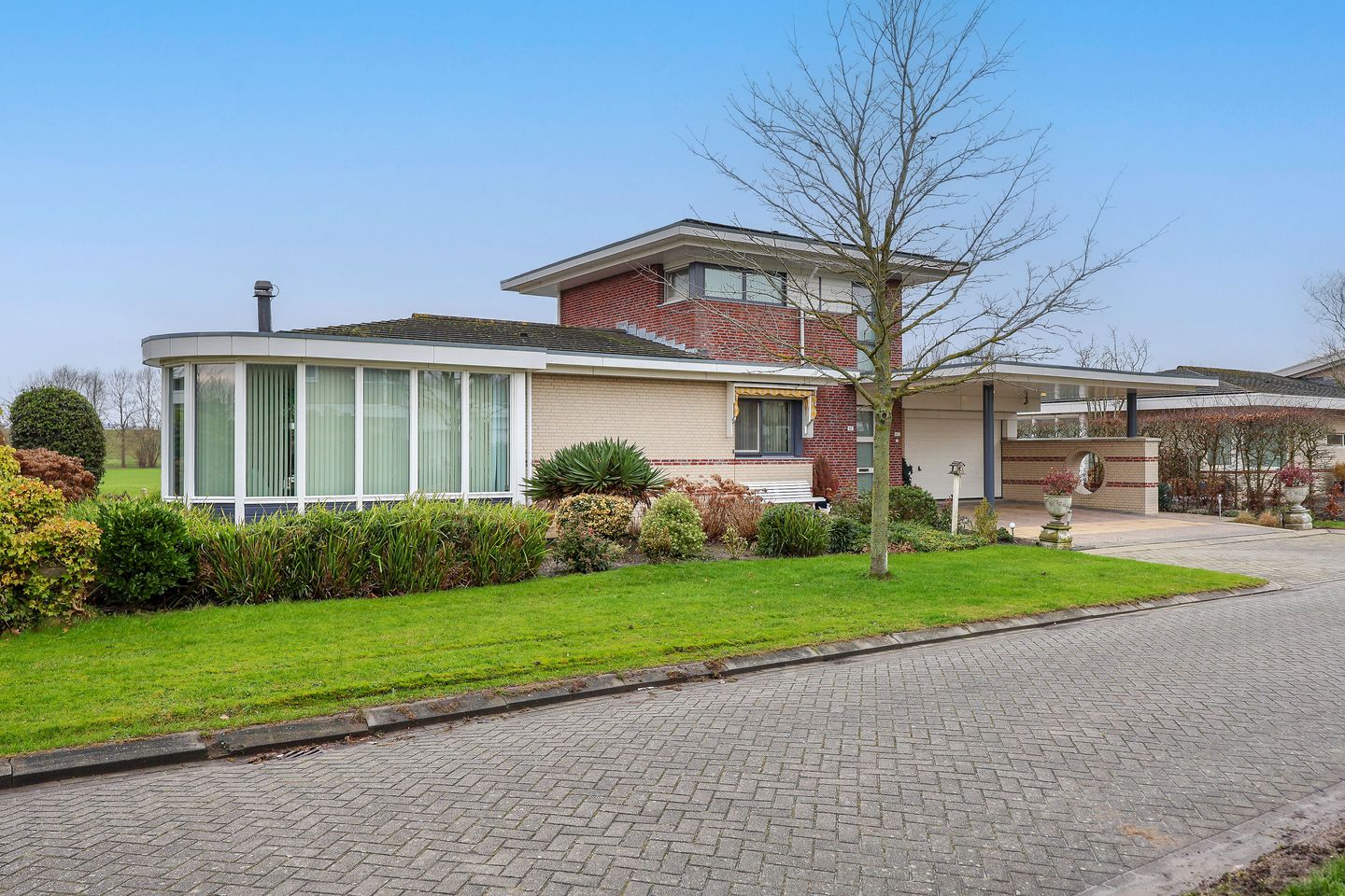 Aan de voorzijde van de woning bevindt zich een brede oprit met parkeergelegenheid voor meerdere auto’s.