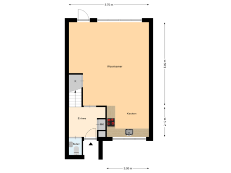 Via de voordeur komt u in de entree met de garderobe, meterkast, opgang naar de eerste verdieping en deur naar de ruime woonkamer.