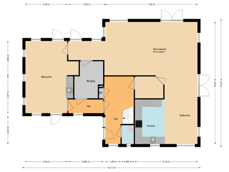 Zowel de berging als de bijkeuken geven doorgang naar de hal, die leidt naar de entree van de woning.