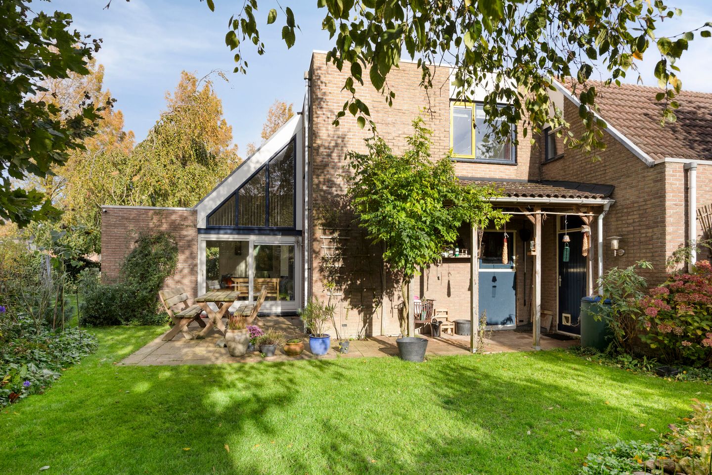 Rondom het huis ligt een volwassen, groene tuin die privacy en rust biedt. Met een zonnig terras, een overkapping, gazon en genoeg ruimte voor speeltoestellen of de barbecue. Dankzij de ligging op het zuidwesten zit je hier heerlijk in de zon, terwijl de natuurlijke beplanting zorgt voor beschutting.