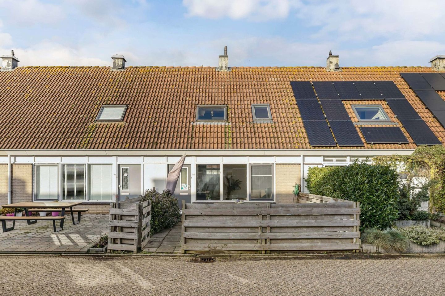 Ruime geheel betegelde voortuin met keurige schuttingen op het zuid oosten gelegen