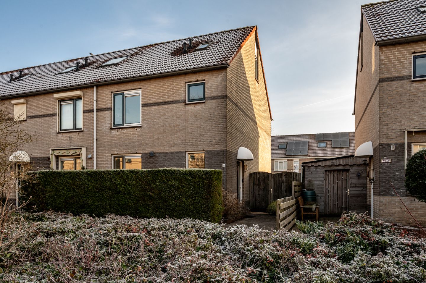 De fraai aangelegde tuin is gelegen op het oosten en voorzien van meerdere terrassen met bestrating, borders met (fruit)bomen en beplanting, een vrijstaande houten berging en een praktische achterom. Doordat de woning op een hoek is gelegen en over een grote zij-tuin beschikt, kunt u de hele dag genieten van de zon in uw tuin.