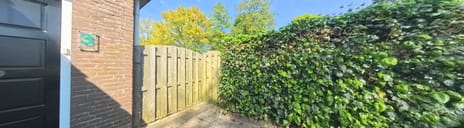 De woning beschikt over een ruim opgezette achtertuin met een betegeld terras en een royaal gazon. De tuin wordt omsloten door een groene haag, wat zorgt voor een natuurlijke afscheiding en een rustige sfeer. Er is voldoende plek voor een zitje, speelruimte of het aanleggen van extra beplanting.
