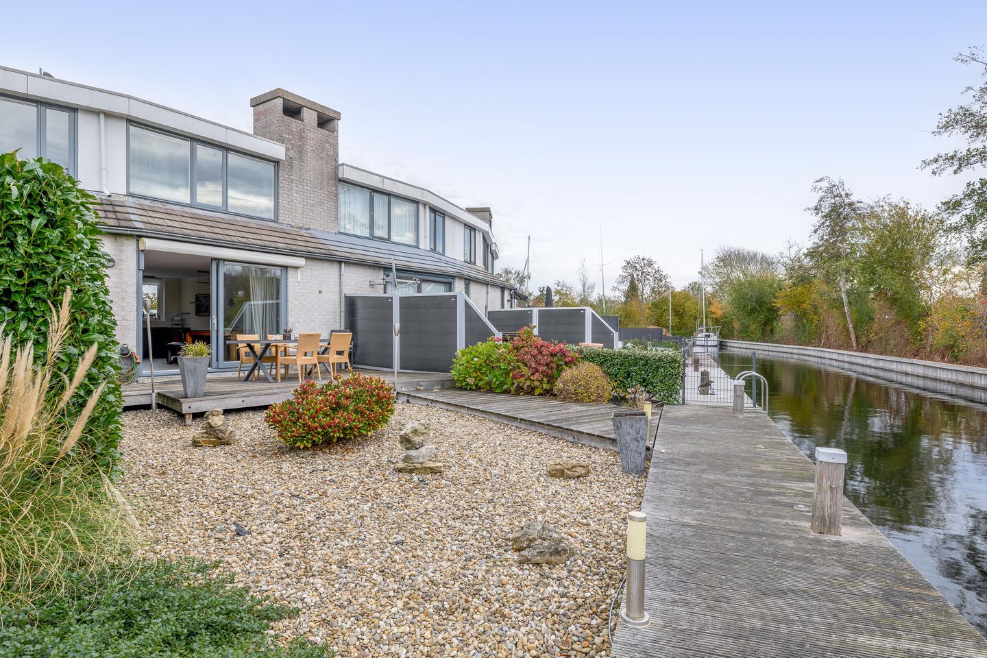 De via de schuifpui te bereiken fraai aangelegde tuin op het zuidwesten is uitgevoerd met groot vlonderterras, grindstrook, groene erfafscheiding, tuinverlichting en steiger met aanlegpalen en zwemtrap. Dankzij de gunstige ligging geniet u hier volop van de zon en het uitzicht over het water.