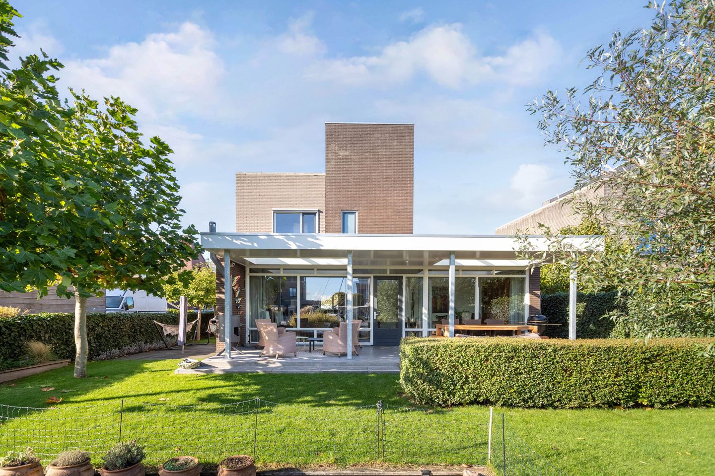 De woning is speels en strak vormgegeven, met een royale woonkamer die helemaal gericht is op de tuin en het water. Grote raampartijen zorgen voor licht,