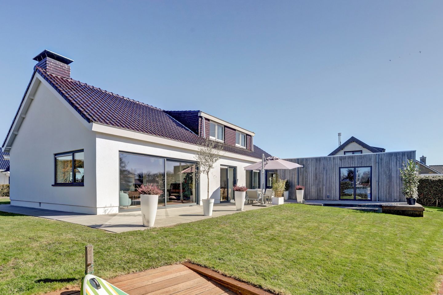 De tuin ligt op het zuidwesten en is verzorgd aangelegd met gazon, een royaal terras en buitendouche. De brede oprit biedt voldoende parkeergelegenheid op eigen terrein. De strook eigen water met lange steiger is geschikt voor het aanleggen van een of meerdere boten (staande mast) en er is een aflopende steiger voor bijvoorbeeld een bijboot, kano of SUP-board. De walbeschoeiing is geheel vervangen in verkeert in uitstekende conditie.